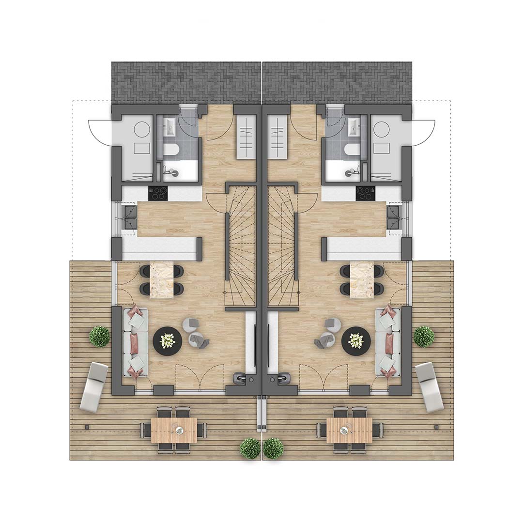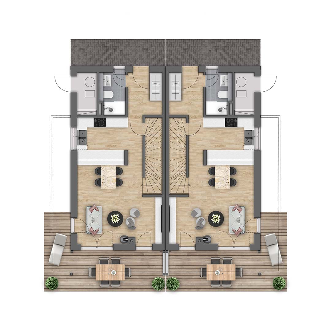 Sie betreten das famose Ferienhaus Frida mit seinen 123 Quadratmetern Wohnfläche durch den Entree-Bereich mit Garderobe, vorbei an Duschbad und Treppe gelangen Sie in den Wohn- und Lebensbereich mit anschließender Terrasse. Die Küche ist offen angelegt und viele Fensterflächen lassen das Sonnenlicht der Ostseeküste hell einströmen. Im Obergeschoss der Doppelhaushälfte sind zwei großzügige Schlafzimmer für erholsame Nächte und ein weiteres Duschbad mit Platz für die Infrarotkabine untergebracht. Die harmonisch in den Grundriss integrierte Außentreppe führt vom Obergeschoss auf die große Dachterrasse mit herrlichem Ausblick.